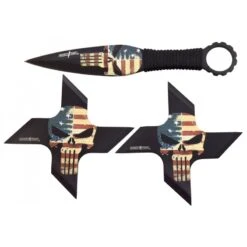 Avec la référence 32408, Martinez Albainox vous propose 3 couteaux de lancer tendances, riches en couleurs. Chaque couteau bénéficie d’une fabrication en acier 3Cr13MoV, avec un manche encordé de couleur (pourpre, bleu ainsi que jaune) pour une meilleure préhension. Chaque couteau de lancer est très harmonieux, puisque la lame se dote d’une finition de couleur, la même que celle du manche bien entendu. On notera la présence d’une zone sombre avec motif coloré au centre, la lame est ajourée par de nombreux petits trous, le manche lui est marqué en bout par le logo Albainox blanc sur fond noir pour le contraste. Nous vous informons que la longueur totale d’un couteau est de 18,9cm (10cm pour la lame contre 89mm pour la poignée). Tout ce beau monde pourra venir se loger dans un étui de rangement/protection en nylon noir, il serait dommage d’abîmer de si jolies pièces.