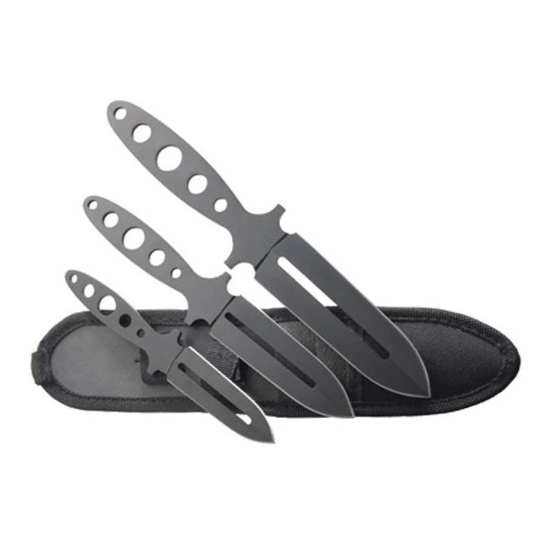 Voici un jeu de 3 couteaux de lancer Herbertz (modèle 130926), ayant la particularité de tous être fabriqués en acier inoxydable 420, coloris noir. Les lames sont ajourées par un rectangle aux bords arrondis sur presque toute la longueur, au niveau du centre. Elles sont de tailles diverses : 8, 10 ainsi que 12cm de long. Les manches des couteaux de lancer Herbertz sont à trous, au nombre de cinq pour être aussi précis que possible. Les ajours ronds sont de tailles variables, pour un effet des plus élégants, des plus attrayants. À noter qu’en plus d’apporter du style, cela rend aussi le poids plus léger ! Les 3 couteaux de lancer, par Herbertz, vous seront livrés avec un étui en nylon noir au design sobre. Vous l’aurez deviné, il permet un transport simple et sans encombre, tout en assurant un rôle protecteur lors des déplacements et mouvements.