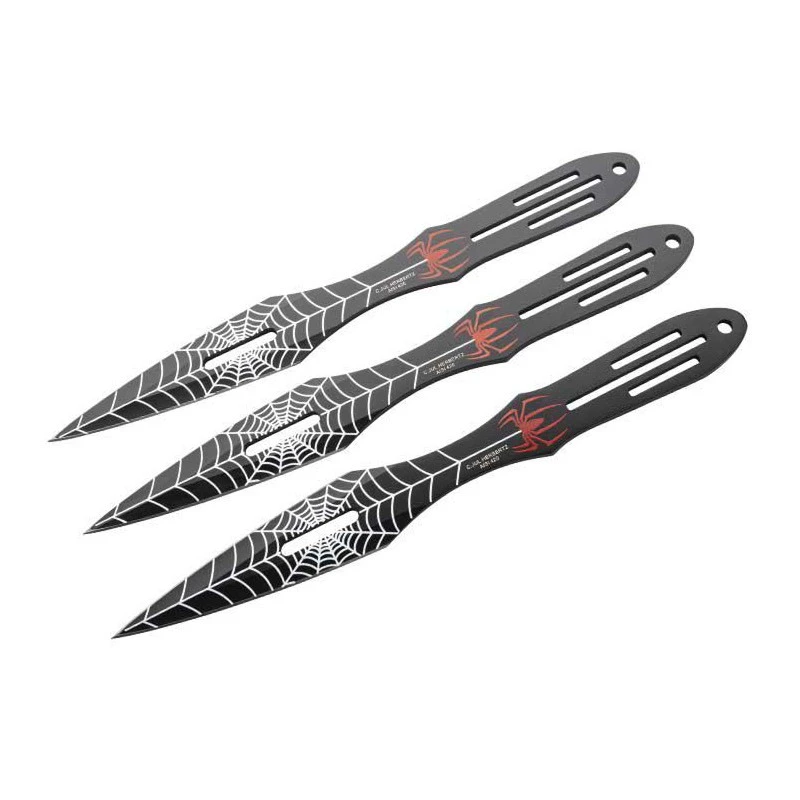 Pour pouvoir utiliser ces 3 couteaux de lancer Herbertz 584500, mieux vaut ne pas être arachnophobe ! Ils sont fabriqués en acier inoxydable 420 pour la résistance à la corrosion, et avec revêtement noir pour le style. Les 3 couteaux de lancer sont décorés par une araignée rouge ainsi que par une grande toile blanche sur la lame ajourée, particulièrement pointue. Bien sûr, le coloris blanc n’a pas été choisi au hasard, il assure une visibilité optimale par contraste. On peut apercevoir, de façon discrète, le nom de la marque Allemande, à savoir Herbertz, à l’origine des 3 couteaux de lancer. Les manches sont aussi ajourés par des traits de longueurs variables, ainsi que par un trou en bout permettant d’y passer corde ou ficelle. Pratique, un étui de protection en nylon noir vous est fourni, afin de pouvoir transporter vos couteaux de lancer Herbertz araignée avec simplicité, efficacité et élégance !