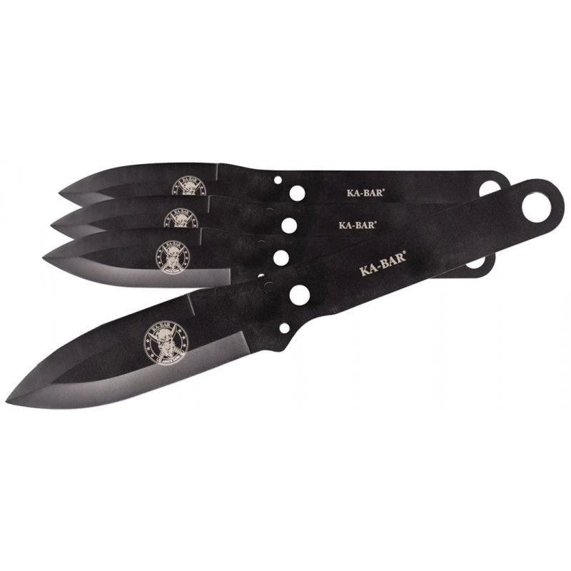 Le design des couteaux est pensé pour le lancer, avec une lame qui assure un meilleur équilibre et une meilleure stabilité lors du vol. Les couteaux portent le logo du crâne KA-BAR sur la lame, ce qui leur donne un aspect distinctif. Ils sont livrés avec une gaine en polyester noir qui protège la lame et facilite le transport.