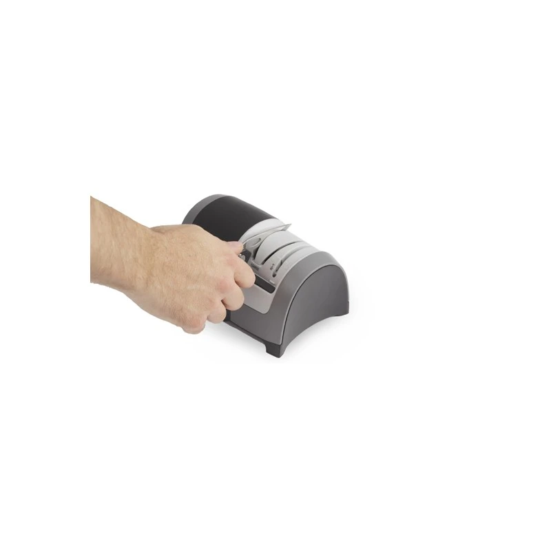 Le Diamond 2 Electric KitchenIQ par Smith’s est un affûteur électrique 240V bénéficiant de deux roues d’affûtage diamantées (grossier et fin). Simple d’utilisation, l’aiguiseur intègre également des guides-lames permettant de maintenir le couteau avec un bon angle pendant l’affûtage électrique. Tout le monde peut y arriver, cela ne nécessite aucune compétence, il suffit juste de se laisser guider. L’affûteur électrique Smith’s référence 50387 fonctionne à l’aide d’un gros bouton marche/arrêt. Une fois que vous aurez affûté les deux côtés de la lame avec les deux roues, KitchenIQ recommande d’utiliser les pierres de céramique croisées dans le guide-lame de finition manuelle pour l’aiguisage final. Un accessoire très pratique qui permet d’entretenir toutes vos lames de couteaux.