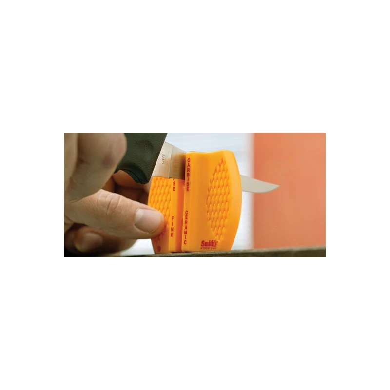 De couleur jaune, cet affûteur manuel Smith’s 50726 est muni de deux étapes. Il y a dans un premier temps le côté « Coarse Fine » assurant un premier affûtage grossier de la lame de votre couteau. L’autre côté est marqué du texte rouge « Carbide Ceramic » : c’est une tige céramique pour obtenir un tranchant rasoir. Il faut également savoir qu’un guide d’angle est présent, cela assure de réussir son affûtage en toutes circonstances. Cet affûteur manuel 2 étapes Smith’s 50726 est très ergonomique si bien que la prise en main est toujours optimale. Les pieds sont antidérapants afin que l’affûteur ne glisse pas durant l’affûtage de votre lame. L’autre avantage non négligeable, c’est que l’affûteur est facile à transporter : il vous accompagnera durant tous vos déplacements.