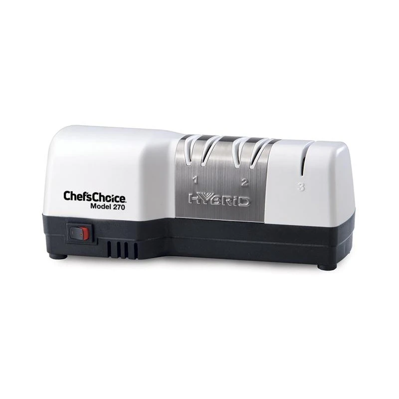 Le Chef’s Choice Hybrid 3 a vocation à entretenir les lames de vos couteaux de poche, de chasse mais aussi de cuisine. Muni de 3 étapes, cet aiguiseur est électrique au niveau des deux premières étapes (pré-aiguisage, aiguisage), tandis que manuel pour la dernière (affûtage). Doté de la technologie d’affûtage CrissCross, l’aiguiseur électrique Chef’s Choice Hybrid 3 va donner énormément de tranchant à vos couteaux, et ça, que les lames soient droites, lisses ou crantées ! Le travail est facile grâce aux guides en acier inoxydable brossé et durable, ils sont numérotés afin de toujours exécuter l’action voulue (limiter le risque d’erreur). Les étapes 1 et 2 permettent un affûtage rapide tandis que l’étape 3 offre un tranchant rasoir. L’aiguiseur électrique Chef’s Choice Hybrid 3, modèle CC.270, est conçu et assemblé aux Etats-Unis, il est garanti pendant un an dans le cadre d’une utilisation normale. Il va redonner une seconde jeunesse aux lames de vos couteaux ! Bord 20°.