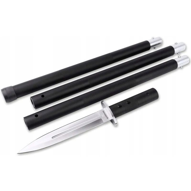 Cet épieu démontable se compose d’un couteau amovible et de trois segments cylindriques à assembler, longs de 50,5 cm. Cette conception offre une meilleure flexibilité, ainsi que la possibilité de tenir le couteau directement dans la main pour couper du bois, des cordes, du gibier. Le dernier segment se complète d’une butée caoutchouteuse, qui peut fournir un soutien pendant vos promenades en forêt.
