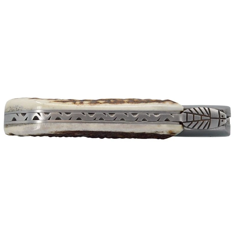 Le manche, long de 125 mm, est conçu en bois de cerf, un matériau à la fois élégant et agréable à tenir en main. Sa forme légèrement affinée à l’extrémité permet une prise en main confortable.