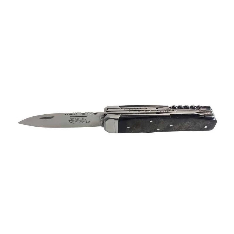 Fortement apprécié des chasseurs et amateurs d’activités Outdoor, en extérieur, le Douris Chastel Hallali Chasse est fabriqué en France de façon artisanale. Ce modèle se distingue par son manche en croûte de buffle, monté par rivets, aussi élégant que confortable à prendre en main. Il est aussi apprécié pour sa forte polyvalence en raison de ses 6 pièces que voici :