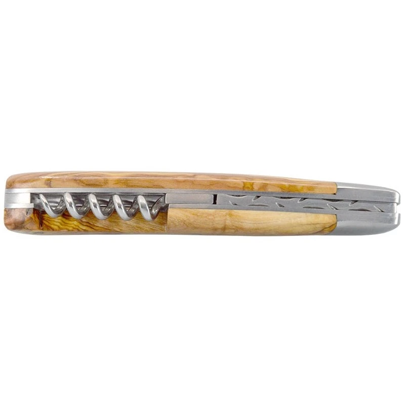 De forme courbée pour plus d’élégance, le manche est confectionné en olivier, dont la teinte est claire avec un veinage plus foncé. Intégrant une mitre protectrice en inox, il comprend également un tire-bouchons pour vos apéros improvisés, toujours avec modération. Sa longueur de seulement 85mm fait que le couteau pourra être facilement emporté au quotidien.