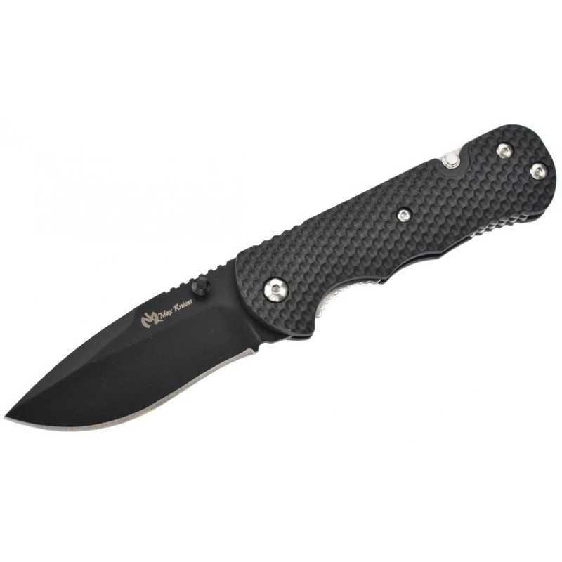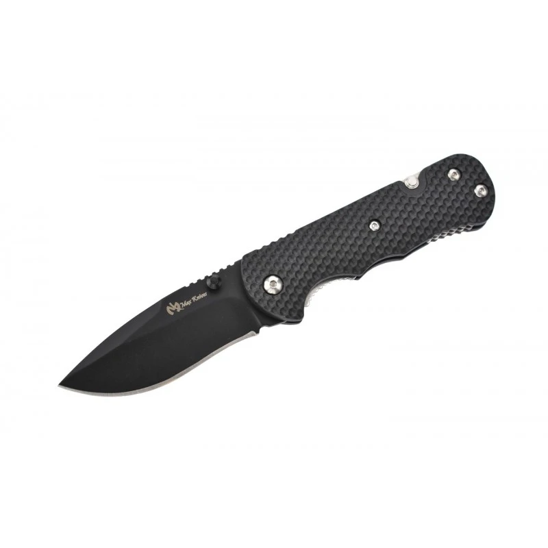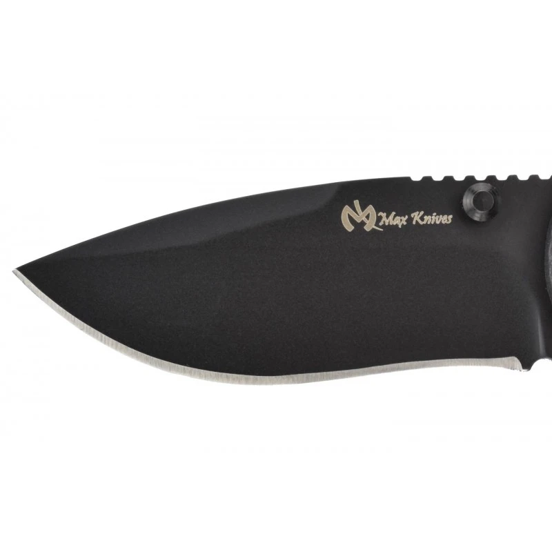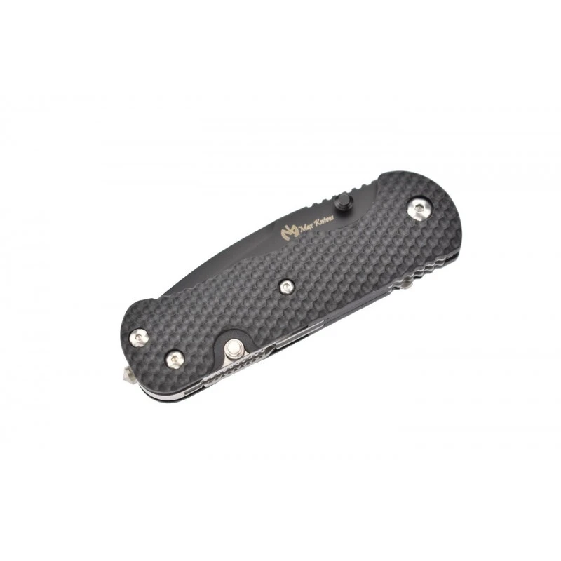 Le Max Knives MK103 est un couteau multifonction pliant, à verrouillage liner lock, et au design entièrement noir. Sa lame à la finition noire est fabriquée en acier inoxydable 440C, elle mesure 76mm de long et se voit décorée par le logo Max Knives en blanc pour un contraste optimal. On mentionnera la présence d’un double thumb stud visant à déployer la lame plus facilement grâce au pouce. Sinon le tranchant est de mise, tout comme la résistance à la corrosion/rouille.