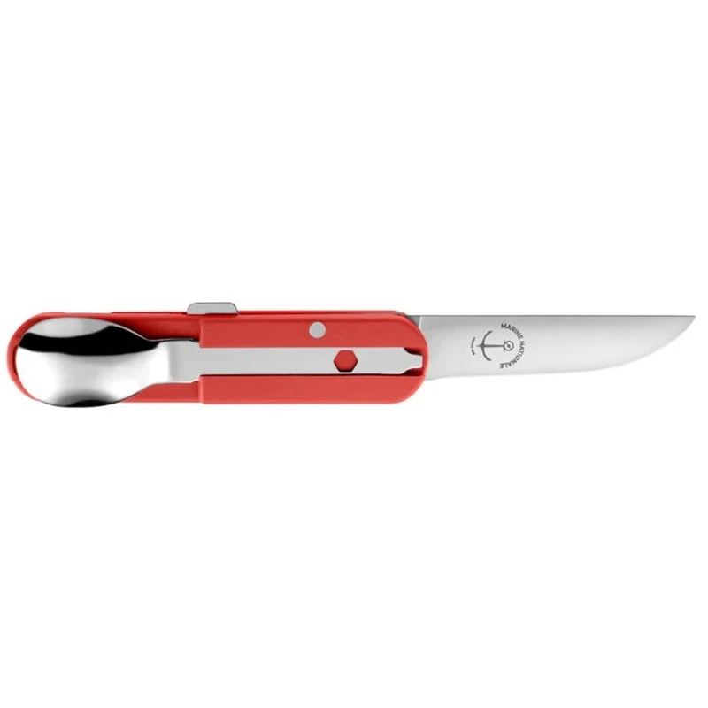 Sa lame en acier inoxydable trempé mesure 9 cm de long et possède une dureté HRC de 51. Le manche en ABS rouge, à la fois solide et ergonomique, assure une prise en main confortable. Ce design astucieux permet également d’intégrer un système de glissière breveté pour accueillir une fourchette et une cuillère de chaque côté. Ce système ingénieux est particulièrement pratique pour les repas en plein air.