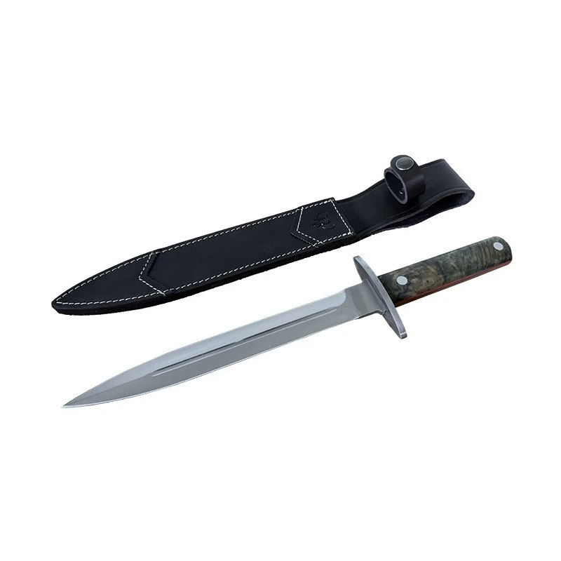 De conception full tang pour plus de solidité, cette dague de chasse arbore un manche en bois noyer turc avec intercalaires rouges. Il est particulièrement plaisant à regarder, mais aussi à utiliser. Les rivets servant à la fixation des plaquettes sont en aluminium.
