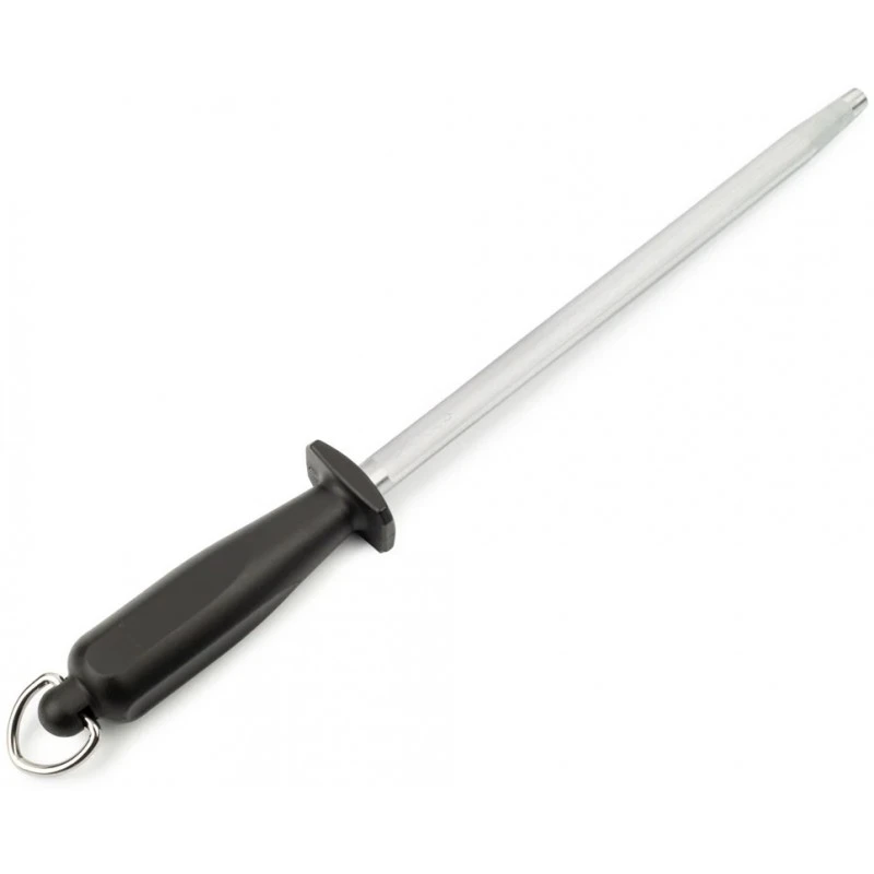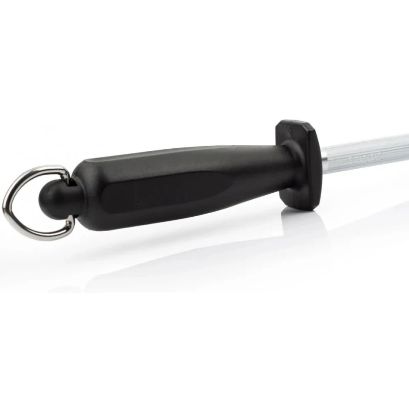 La garde entre la tige et le manche empêche votre main de toucher la tige pendant l’aiguisage. Quant à l’anneau en bout de manche, il permet de suspendre l’accessoire contre le mur de votre cuisine.