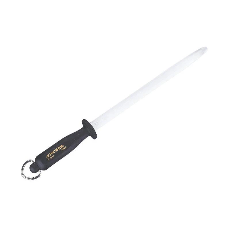 La marque française Fischer, seul fabricant de l’hexagone à produire des fusils à aiguiser, nous propose cet ustensile de très bonne facture conçu en acier trempé d’une longueur de 25 cm avec une mèche ovale. Son manche acrylique noir permet une bonne prise en main. Il possède un anneau de suspension, ce qui vous permettra de l’accrocher sur un des crochets de votre cuisine et y avoir accès rapidement.