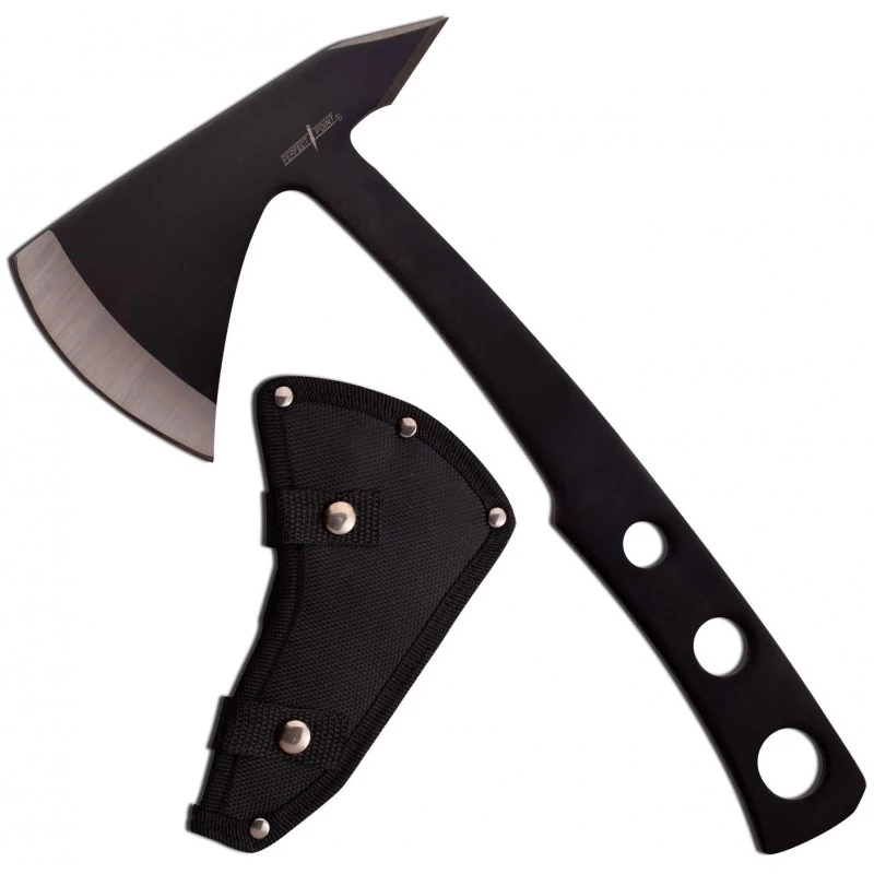 Issue de la marque Perfect Point, cette hache de lancer, modèle PP-107B, est dotée d’une lame de 4mm d’épaisseur, conçue en acier inoxydable. Elle arbore une finition 2 tons très élégante, en étant à la fois noire et satinée. Son manche, ajouré à trois reprises, est lui aussi fabriqué en acier inoxydable noir. Pour plus de sécurité et un transport plus simple, la hache de lancer est livrée avec sa gaine en nylon. Longueur totale : environ 241mm.