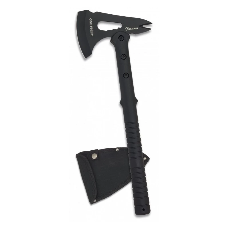 Cette hache tactique One Fight de la marque Martinez Albainox dispose d’un rapport qualité/prix très interessant. Sa lame de 15,5cm de longueur (épaisseur 5,55mm) est construite en acier inoxydable 3Cr13MoV à la finition noire, ajourée au centre pour un style affirmé.