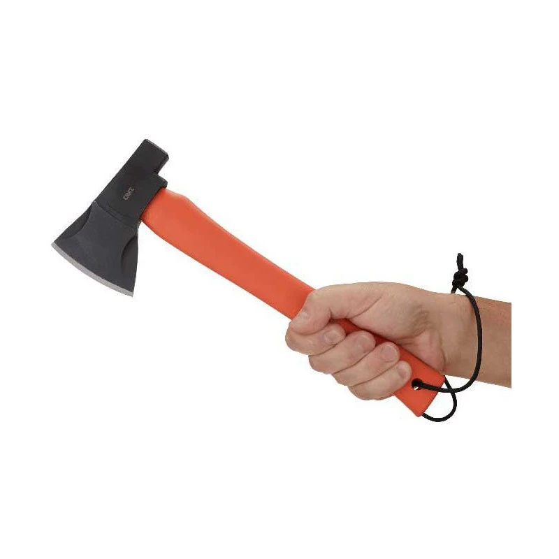 La lame est fabriquée à partir d’un morceau d’acier carbone 1055 forgé à chaud, elle est extrêmement tranchante/puissante et s’avère être enrichie, de façon discrète, par le logo de la marque américaine CRKT. Le manche est quand à lui conçu en nylon renforcé de verre robuste et léger, d’un beau coloris orangé permettant de rapidement retrouver la hachette en cas d’égarement. Le cordon noir en bout permet de l’attacher, la transporter avec toujours plus de facilité.