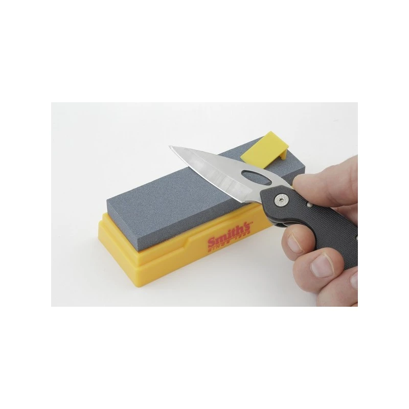 Très complet, ce kit d’affûtage Smith’s ST50727 comprend deux pierres à affûter, un flacon d’huile à aiguiser ainsi qu’un guide d’angle. Il y a une pierre au grain médium (600), montée sur une base en plastique moulé jaune Smith’s, qui convient parfaitement pour l’aiguisage des couteaux. Il y a également une pierre d’Arkansas au grain fin idéale pour la finition, elle se range sous la base en plastique ce qui est très pratique. Simple d’utilisation, voici comment fonctionne le kit de 2 pierres à affûter SK2 Smith’s :