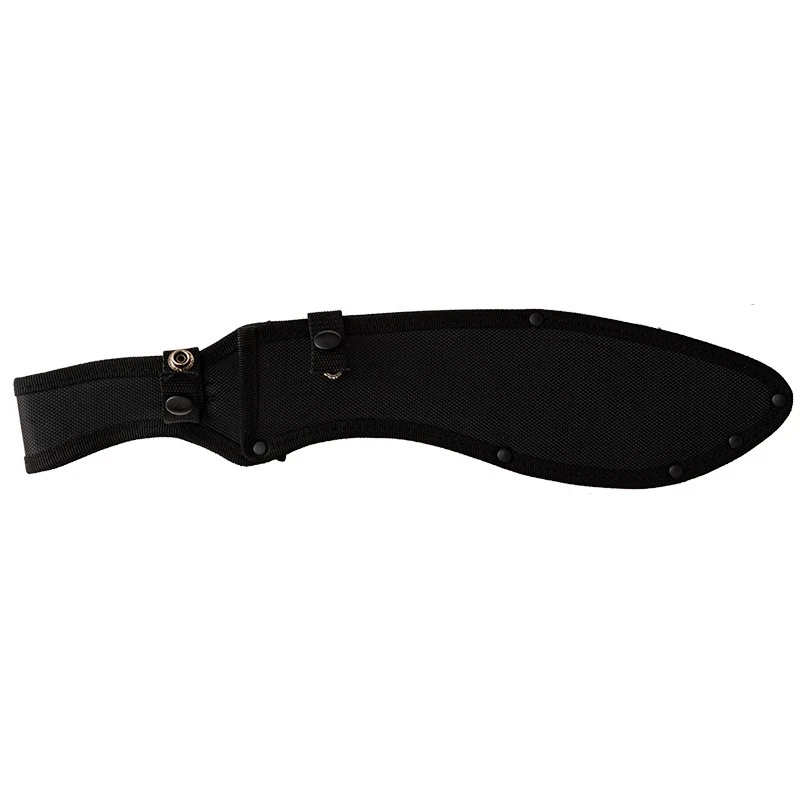 La confortable et jolie poignée noir et orange épouse parfaitement la forme de la main. Les deux plaquettes synthétiques qui la composent sont fixées à la construction métallique grâce à quatre vis. Un trou pour lanière a été ajouté sur le bout du manche. Afin de protéger la machette et l’usager lors de son transport, une solide gaine en nylon avec bouton pression est fournie par le coutelier allemand.