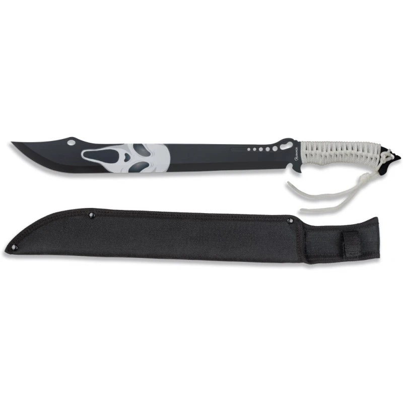La machette Albainox 32657 Tête de mort est un outil exceptionnel, alliant style et fonctionnalité. Sa lame de 35 cm en acier inox 3Cr13Mov avec une finition noire et un décor en impression 3D garantit une robustesse et une résistance accrues. Le manche de 14.5 cm, astucieusement encordé, offre une prise en main confortable et sécurisée.