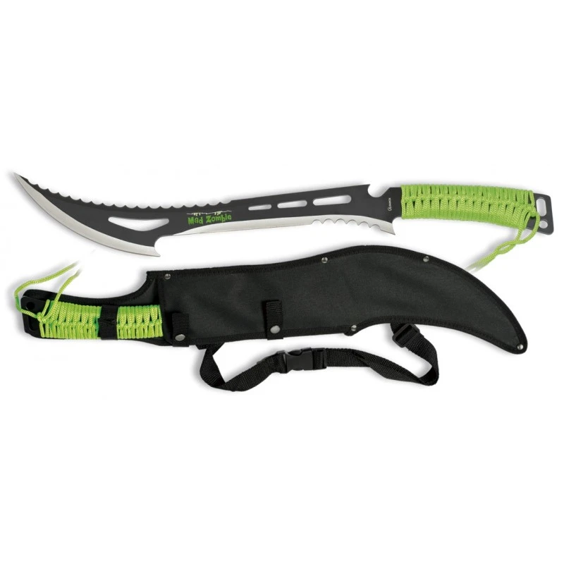 Cette machette Albainox Mad Zombie, modèle 32271, se distingue par son design unique, atypique. Sa lame de 42,5 cm en acier 3Cr13Mov est de type pleine soie, ou « full tang », ce qui lui confère une solidité accrue pour résister aux conditions les plus sévères. Son épaisseur est de 2,88 mm. Elle est polyvalente grâce à son tranchant à la fois lisse et denté, permettant d’aborder diverses tâches, aussi bien celles nécessitant de la précision comme de la force.