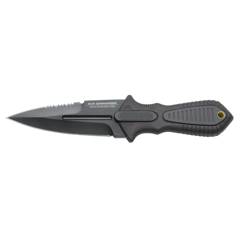 Une version simplifiée du Combat Commander’s Sub Commander Boot Knife, le couteau fixe par excellence pour l’auto-défense. Ce modèle UC3246, signé United Cutlery, est un poignard aussi compact que discret, équipé d’une lame tranchante en acier inoxydable 3Cr13 au revêtement noir. À double tranchant, la lame comporte une rainure au centre ainsi que des dentelures partielles sur un bord.