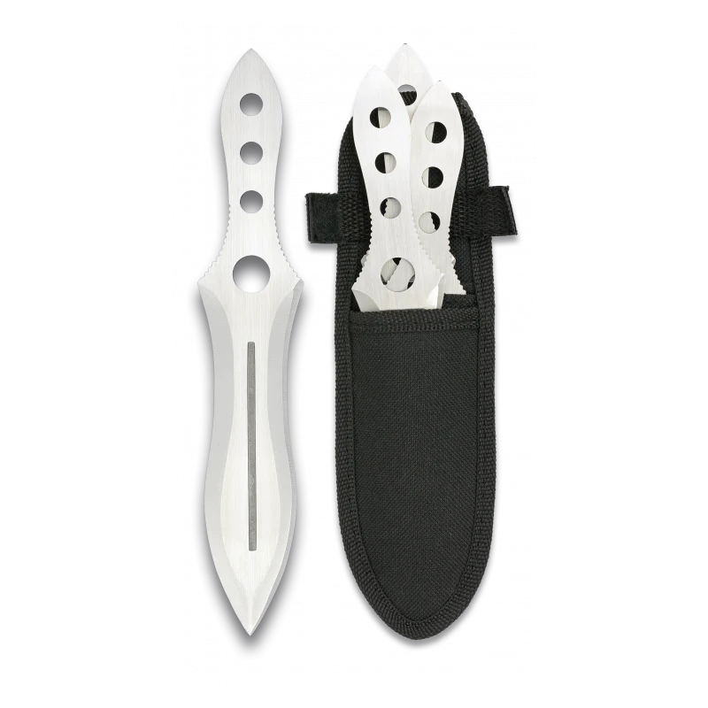 Chacun de ces couteaux est constitué d’une pièce en acier inoxydable 3CR13MOV, un alliage estimé dans le monde de la coutellerie pour sa ténacité, sa dureté ainsi que sa facilité d’aiguisage. Leur design, particulièrement travaillé, est composé de nombreux petits détails qui en font de très belles armes. Parmi ces finitions, le manche est ajouré de multiples cercles de calibres différents, la lame quant à elle possède une gouttière sur toute sa longueur : des spécificités esthétiques mais aussi utiles puisqu’elles offrent un équilibre parfait au couteau et allège son poids. Chaque couteau a une longueur de 20.20 cm et un poids de 68 grammes.